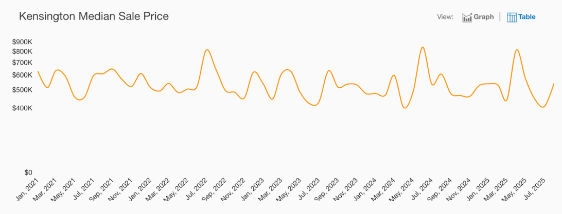 The median house sale price in Kensington in July was $1.7M, up 27.3% year-over-year. Conversely, median condo prices in Kensington trended down 40.7% year-over-year to $422K. Median coop sale price in Kensington was $406K, a change of -10.6% year-over-year.