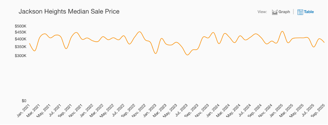 The median house sale price in Jackson Heights in July was $1.3M, up 5.3% year-over-year. Conversely, median condo prices in Jackson Heights trended down 14% year-over-year to $410K. Median coop sale price in Jackson Heights was $326K, a change of -6.6% year-over-year.