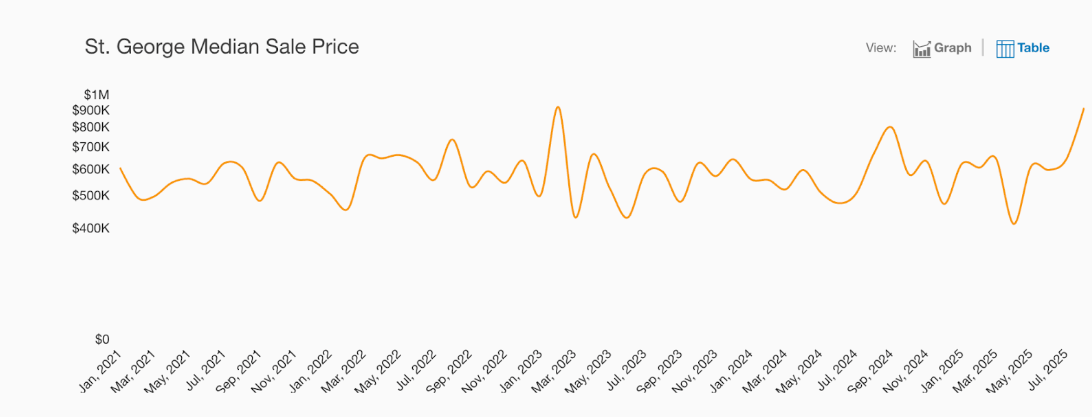 The median house sale price in St. George in July was $619K, up 21.7% year-over-year. However, median condo prices in St. George remained flat year-over-year at $645K. There was no statistically significant data for median coop price activity for the period of July in St. George.
